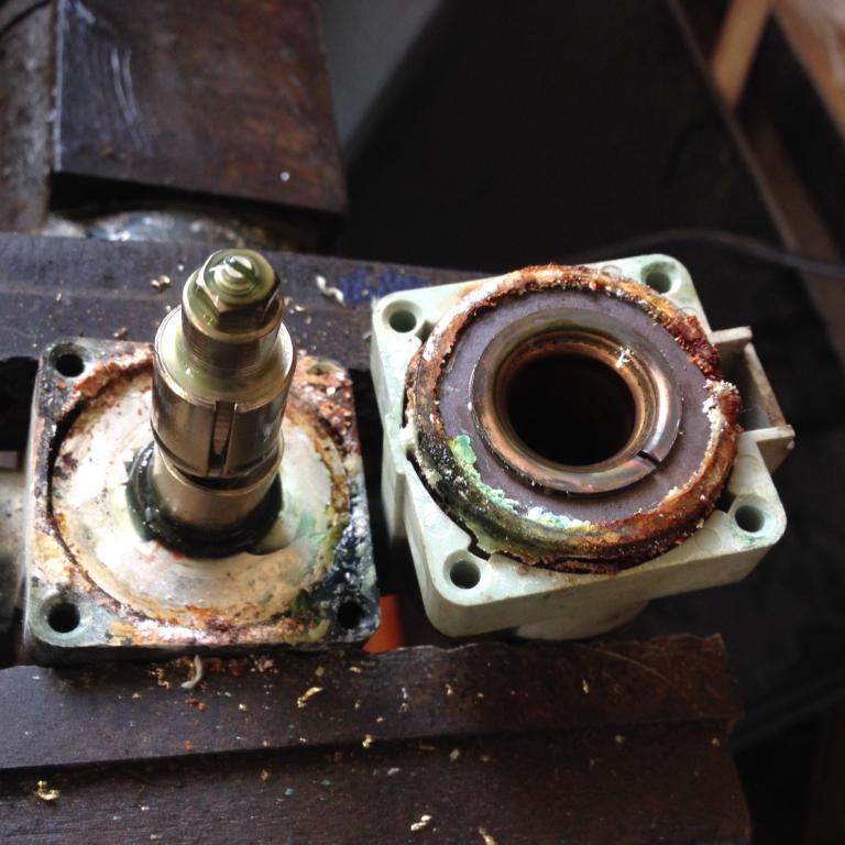 First picture, the exterior, second is the exterior cleaned up which looks ok. Then we decide to drill out the rivets and check the guts since is appeared to be leaking slightly. The thought was to replace the o-ring inside and replace the rivets with screws and washers. Looks like we are going with a new unit. Has anyone had experience with servicing the heater valve vs replacing. Just curious.