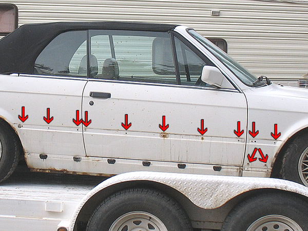 There are holes behind every piece. All the way down the rocker, on the front fender, on the side rear valence, and on the front valence. For example, this is what lurks behind the front fender.93 E30 325ic BrilliantRot M20B25 TCD S2+ GS637BZ CT3582R MS2