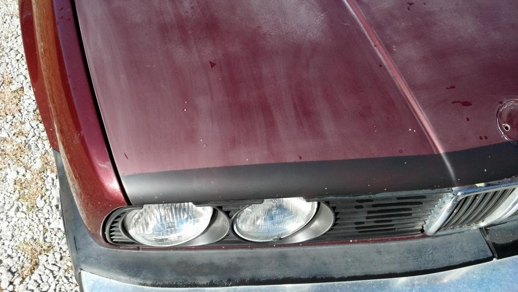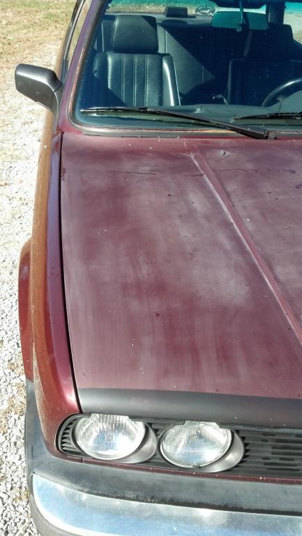 Ignore the black strip up front. That's all the SEM trim paint I had left. I wanted to see how it looked because I was thinking of painting the whole hood with SEM. Just playing around with the car as it's not really worth it to me to get a whole paint job. It's an '87e with 297k miles. So, hood, roof, and trunk are badly oxidized to the point of needing a paint job. I sanded the hood with 600 grit and a palm sander (I know, I know). What do I need to achieve that matte look? Or do you think once I sand down the clear a little that maybe it could be buffed/compounded back to being shiny? BTW, it's not the original paint. It's been painted before I bought it so the paint is pretty thick.