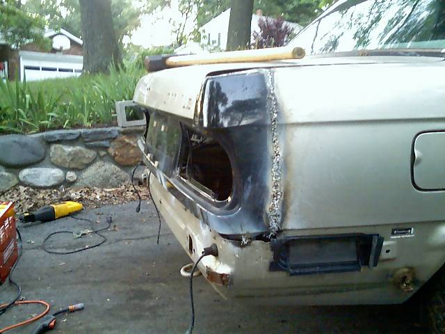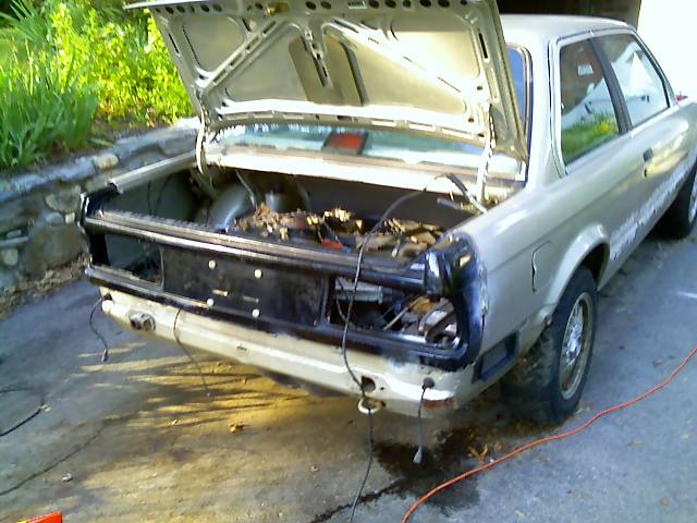 Well, I am starting to work on my project again, and before the m30 goes in I decided to take care of the bodywork. Last fall, moving it around the yard I rearended the BMW with my Jeep. Needless to say, the rear license plate area was destroyed. Well, to fix it, rather than doing it the regular way, I got my hands on the whole back end of a 91. The pics show it right now. I need to still grind down all the welds, and fill and finish the area, but its on. I need to cut and weld the lower valence section after, but for now thought I would post a few pics. In the second pic the rear looks tilted down, but its actually not :) Before everyone flames me lol. A lot of work, but its def worth it for my 325iS.