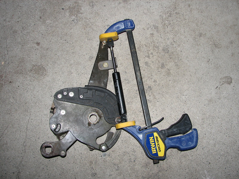 What a lovely project replacing my seat shocks has turned out to be. Turns out you need to be a gorilla to compress the shocks, so I had to go to home depot to buy a C-Clamp. When I got there, I found a really cool clamp gun thingy and bought it instead. It worked fine on the vertical adjusters, but the thing is so bulky that it doesn't work for the backrest, so I had to stop there tonight and I'll have to go to home depot AGAIN tomorrow to buy something that will work. I guess my choice of clamp wasn't as slick as I had anticipated.
