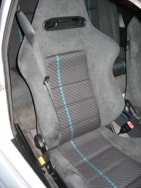 Hey Diego. Thanks for the compliment on the seats. I've been very happy with how they turned out. Unfortunately I don't have any remnant material from the build since these were part of a GB a few years back. A guy in Germany made them. The fabric is original Alpina & the seats are supposedly recovered from a wrecked Sport Evo. As far as the Alcantara part they have held up well also. From what I hear the real Alcantara material actually has Alcantara printed on the backside, is this true?