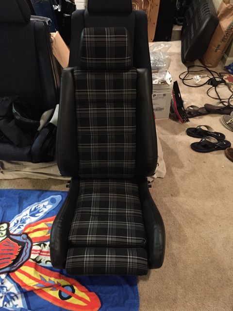 That looks awesome. My only regret would be not going with a red plaid. But it is done. If you haven't finished, he suggested securing the bolsters from the inside first and pulling them tight from the outside, then once both bolsters are on do the centers. The layer of foam he added on the underside of the fabric makes the sport seat much more comfortable