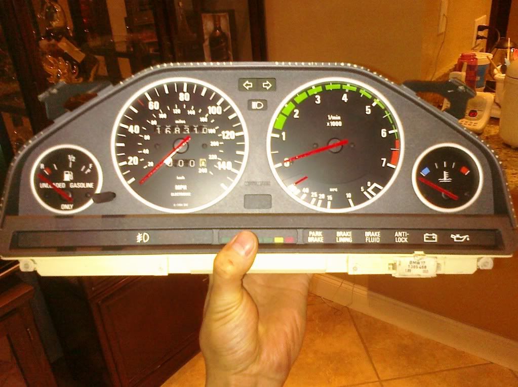 Shitty cell pic, but here it is finished. I still need to bolt everything down, this was just a test fitting to make sure all the damn gauges actually worked this time. I used the same red on the needles as I used before. It's almost orange, and matches the color of the redline area perfectly.