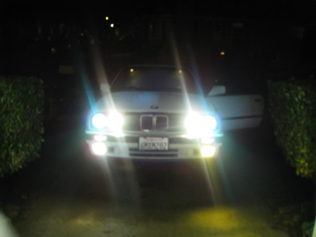 Here are some pictures of the independent fog lights on my car. The first picture is the fog lights, parking lights, and halos on. The second picture is with the lowbeams, fog lights, parking lights, and halos on. The third picture is with everything on.