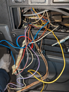 Sharing some pictures of the wiring loom. I see that at some point it was spliced into, but I'm not sure what it's powering (or should be!). One line seems to run from the fuse box into the dash (and to the head unit), while the spliced line runs up into another loom?