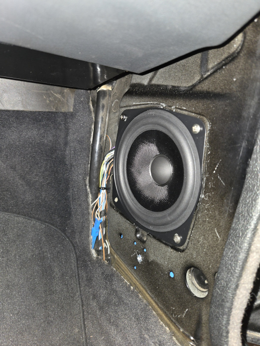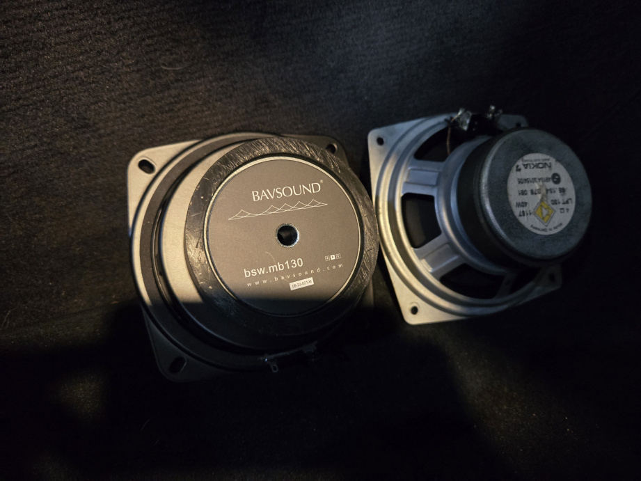 OK, so here are a couple of pictures of the Bavsound Stage 1 mids for E38 mounted and side by side with the OEM Nokias. They're a direct fit. SQ is very good but not audibly better than the Nokias even at higher SPL. (Signal is through a CDT audio 2-way crossover fed by 75W RMS A/B amplification).