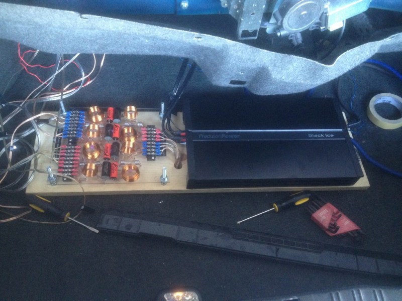 I recently finished overhauling most of the mechanical systems and painting my convertible and have started on the new sound system. I installed a Pioneer DEH-X8600 head unit with a Precision Power amp, E34 mid-bass speakers and Dayton tweeters (as recommended by Luke). I built a second order Linkwitz-Riley crossover with 6K hi pass and 5K low pass. It sounds pretty darn good but could still use something. It *almost* has enough bass for my taste and I will likely end up installing a sub. The tweeters are a little bright (very pronounced "S" sounds) and there is a slight upper midrange resonance that is a little annoying. I have the 3.15kHz band on the head units equalizer turned way down to compensate.