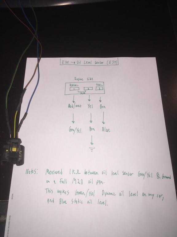 I have been struggling for a while to get my 89 E30 oil level sensor to work and I have even purchased a second one and both fail to shut off the check light. I even tried another check panel and it still fails. I finally cleaned out the sensor and ran the tests found in the oil electrical trouble shooting manual and I discovered that the the two sensor wires are (pin 1 and 3) are swapped based on the wire color from the sensor. The sensor description says pin 3 the GR/YL wire should close at full oil and open and low oil and I found that the blue wire closes at full oil and opens at low oil. I swapped the two wires to the male connector ( moved blue to pin 3 and GR/YL to pin 1 and the switch works as expected and the check light goes out.