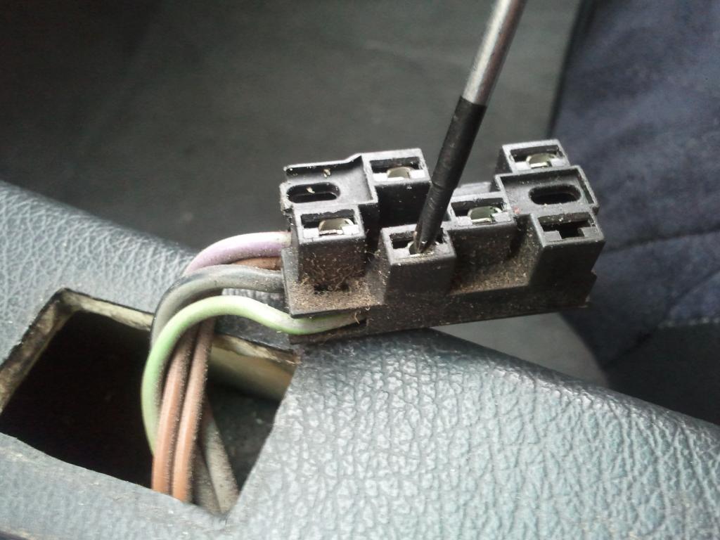 The second photo shows the wiring behind the driver's window control switch. I checked the circuit between the left wire of the first photo and the #3 pin (to the point the screwdriver points) on the driver's side. I hear the "beeeep", so there is no wring cut.