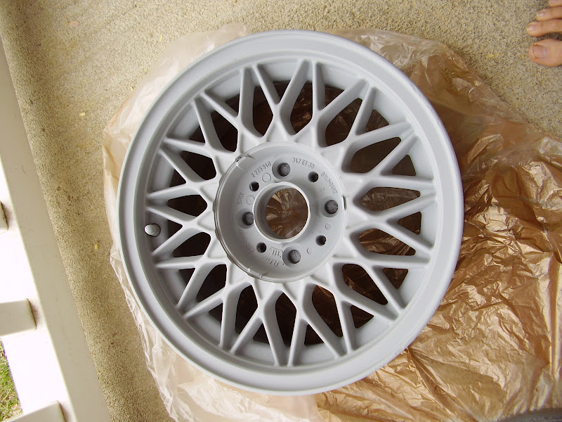 I didn't get any pictures off the wheel completely stripped, but once I had all the old paint, primer, etc off I started applying the primer. I just used some duplicolor primer...