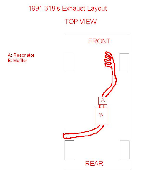 Anyway my weird and possibly totally stupid idea is this: replace stock cat/resonator w/ magnaflow muffler and a resonator, and simply turn the pipe to the side and exit before the rear wheels, as shown in this highly technical schematic: