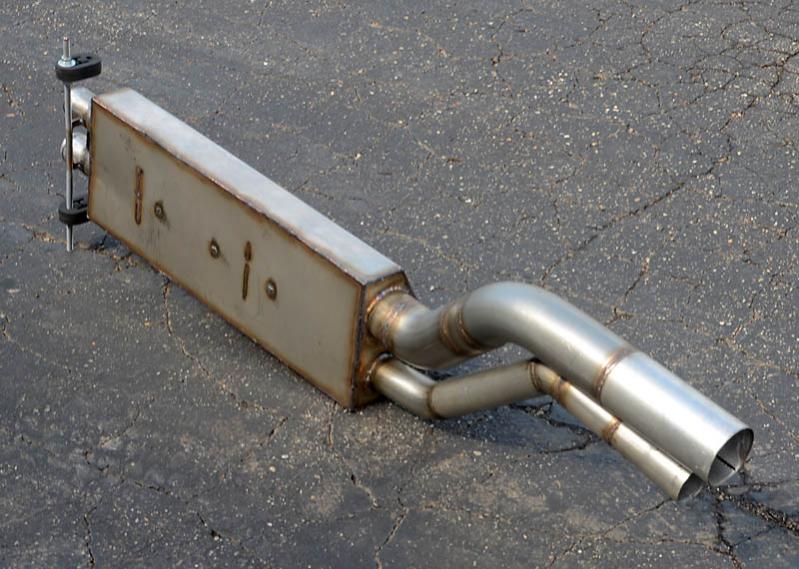 3" down pipe, 2" waste gate dump tube going into one custom built resonator. I had wanted to photograph the inside but my welder got ahead of me and sealed it shut. I put a few baffles inside. 2 - 2" outlets which will eventually go to a rear muffler (possibly custom built by me). 18 gage 304 which is fairly light. I am not sure if this resonator will make noise but if it does I will do something about it.