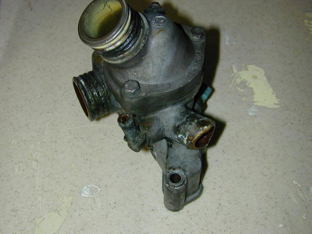 Took about 2.5 hrs to get the starter lying on the ground. Thermostat housing looked shot, ordered a new one. Also some new intake gaskets and some BMW blue coolant for a refill. What a shitty job.