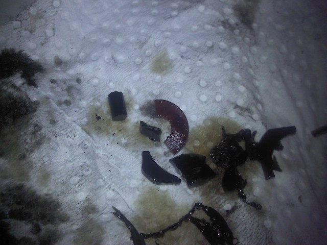 OK so I was changing my oil pan gasket today and took the cap off my oil pump and found some chunks of plastic, one of the chunks was the orange ring around the rod that drives the oil pump.