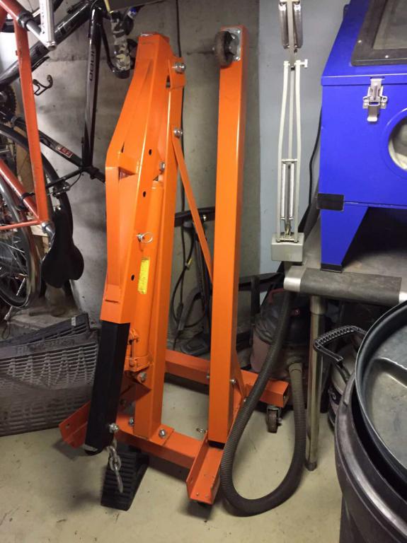 Before I had one, I would attach just the black piece of the stand to the engine while on the hoist, then attach the orange stand to the black part, and slowly wrangle the whole assembly down on the wheels. Not pretty, but it works.