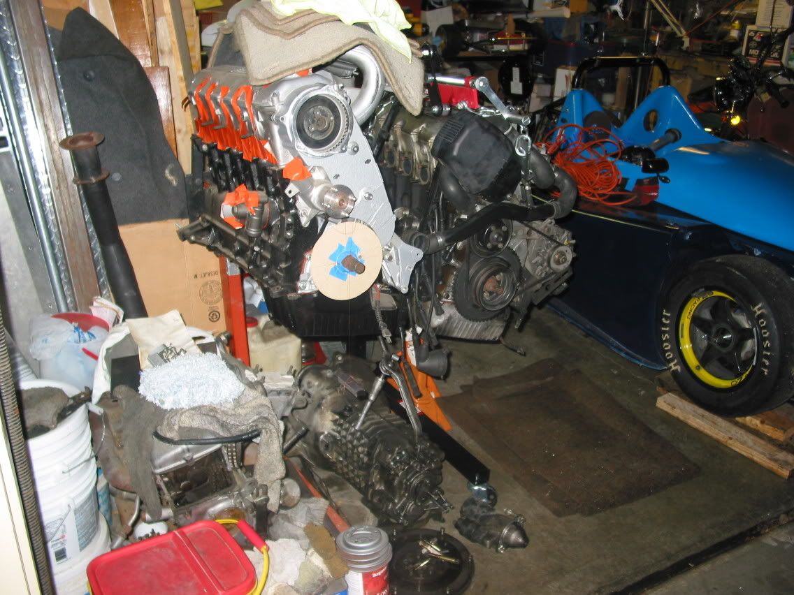 After I got home from work I took off the tranny, clutch and flywheel then mounted it up on another engine stand.