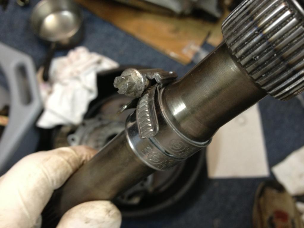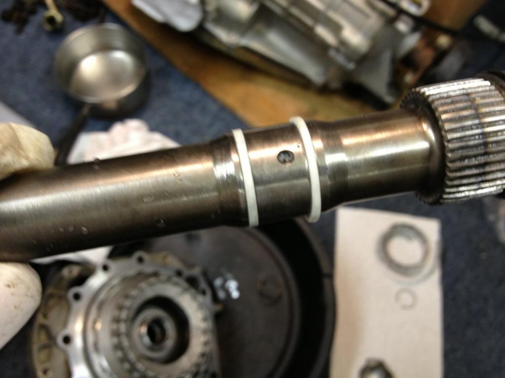 G that's kinda how the AT comes apart. I think you can use a quality sealant at the AT front pump to case joint. If the gasket didn't get torn you can re-use it dry. Now is the time to replace the existing metal input shaft seals with the upgraded teflon. This is the new seals in place, then compressed with a hose clamp, protected by metal strapping, then the final compressed state before reinstalling. The shaft won't go back without damaging them unless you compress them: