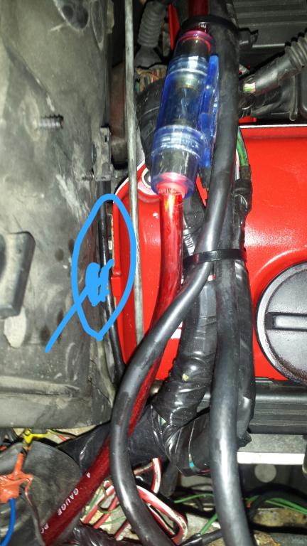 4. slowly lower jack until the gap between the firewall and engine are achieved. This should be minimal, it looks like you only need roughly a half inch, maybe a little more in order to fit a box wrench back there.