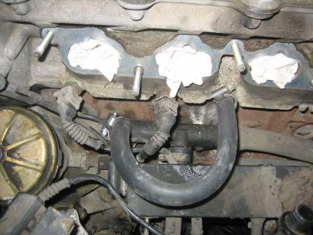 The area here in red shows the piping that fits into the block. Check all your hoses down there while your at it. If you know anything about the "mess under the intake" it might be a good idea to get rid of the throttle body heating plate and all the random hoses not needed.