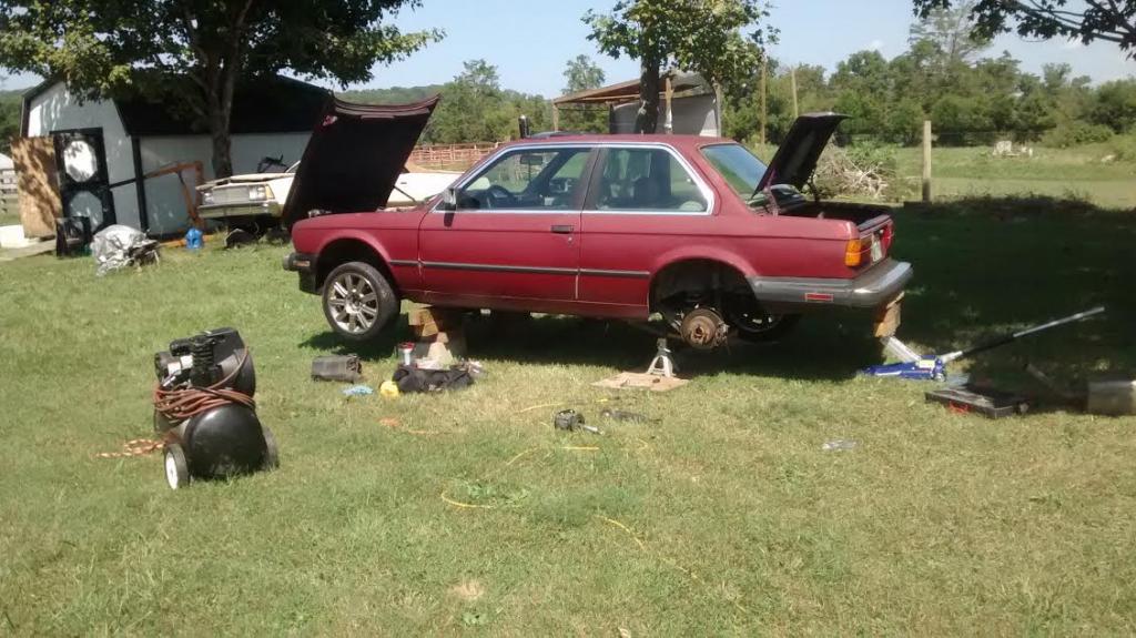 Oh almost forgot I have a jack under the rear bumper too just in case lmbo. And that's the sons El Camino, we were supposed to put the engine in front of it in this weekend but Bimmer comes first, I am going through his big motor right now, he bent some valves in it so I'm going with a 383 stoker assembly I have in the shed and some vortec heads I ported a couple years ago. It was already at 350hp but this should put it in the 400-425 range, but it's kinda heavy, you guys know how it goes HP to LBS rules all.sigpic87 325E The Honey BadgerComment