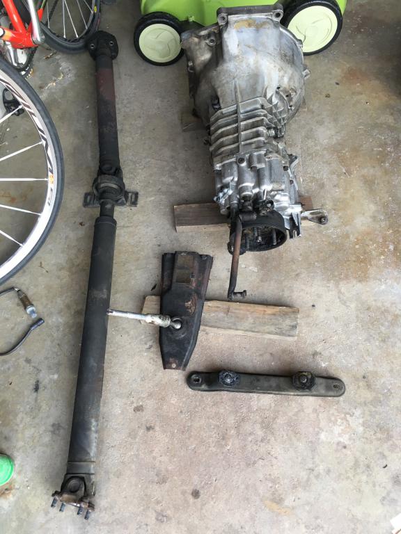 We got an intact driveshaft, cross-member, & plate shifter assembly.