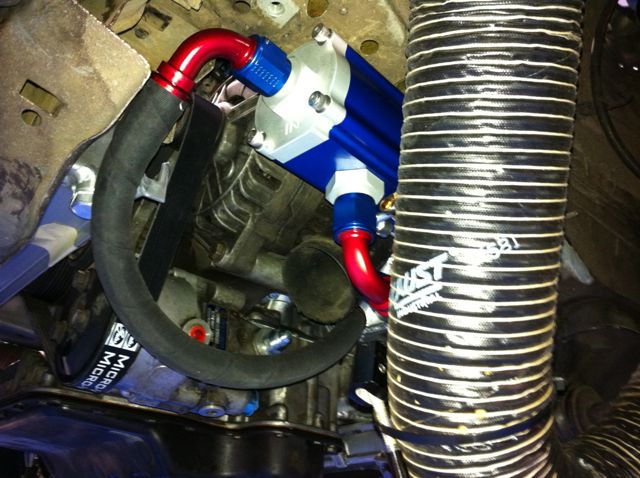 I picked up all of the Parker adapter fittings for the PS pump/rack today, but one 90-degree needs to be swapped out for a straight fitting. After a bit of hand-wringing to determine the mounting location, I installed the remote (Canton) oil filter.