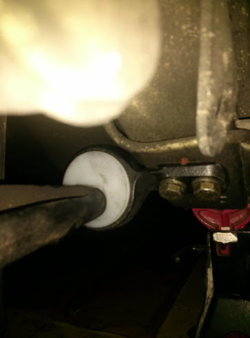 New M3 Solid bushings rotated 90* to compensate for the 10mm drop spacers on the Crossmember. I noticed that after the spacer install the rubber bushing were under a sizable twisting load, compound that with the normal road movement of the suspension. This worried me So I got a set of M3 solids and rotated them 90* down.. Worked like a charm...;)