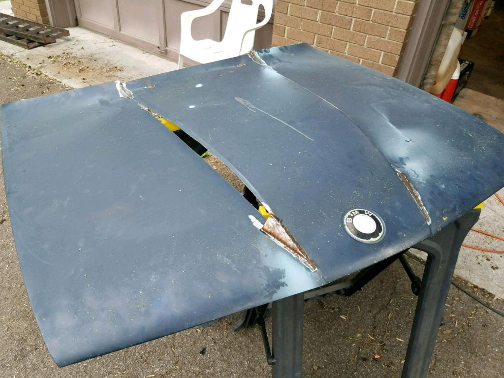 The whole car was being done on a rat rod budget so why stop with the hood? I had a parts car with a semi decent hood (not so good that I felt bad about cutting it up) and I pulled it off and made it fit the engine. I still have the original white hood for the car and will eventually look at doing something with fiberglass. I'll wash the car and throw a coat of matt clear on the hood and call it a day.