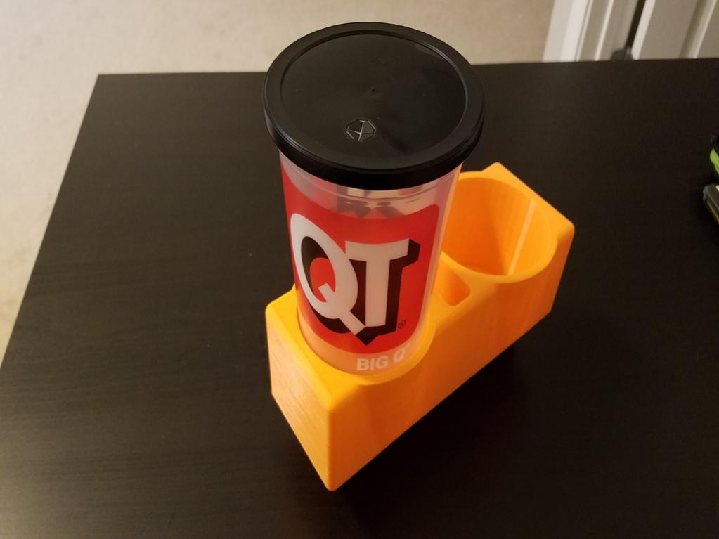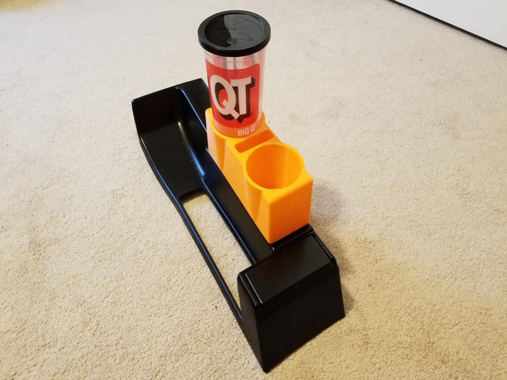 Here I am, a mechanical engineer, with the full capabilities of CAD modeling and 3D printing my own cup holders. So I did exactly that. I modeled the cupholders as shown below to fit in the cubby of the rear center console, with double sided 3M tape or velcro, and fit specifically two Big Q's cups from QT with a slot for coins in between the cups. The material is PLA (polylactide) which is a biodegradable thermoplastic and is sufficiently strong to work as cupholders and very cost efficient. I couldn't be happier with the results.