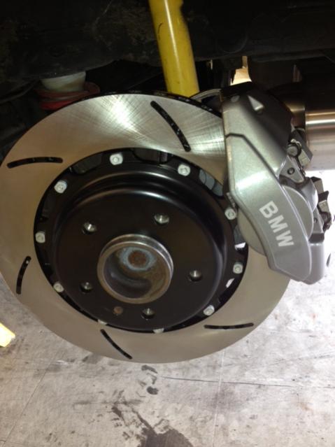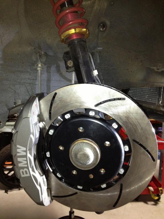 Here are some pictures from the 135i Brake upgrade we did on my e30 M3. (I'm the manufacturer of Rongineer13's 5 Lug kit parts).