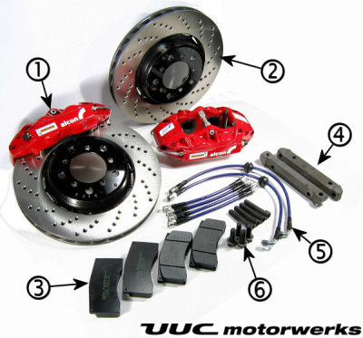 "The 4-piston Z31 caliper used in the front on this E46 kit is a Monobloc design... Calipers are finished with a black anodized surface."