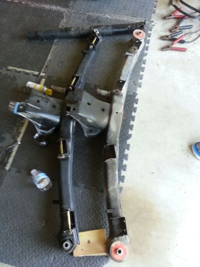 So I've reached the tail end of a full suspension rebuild due to a minor wreck, and I'm stuck on how I should go about an issue I have with my driver side trailing arm. I was putting on my new rear axel on the driver side (old one snapped) and noticed it was a really tight squeeze and required a scissor jack between the diff and lower shock mount to fit in there. Found out that my trailing arm mounts on the driver side of the rear axel carrier are bent. I thought of just dropping everything down and bashing them straight with a hammer, but there is so little room to move in that area that I would like some other input before I just go to town with the hammer.