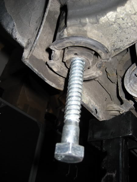 I am trying FredK's slick method for popping the sub-frame bushing out from above by pounding on the pointy end of a 5/8 lag bolt installed from below.