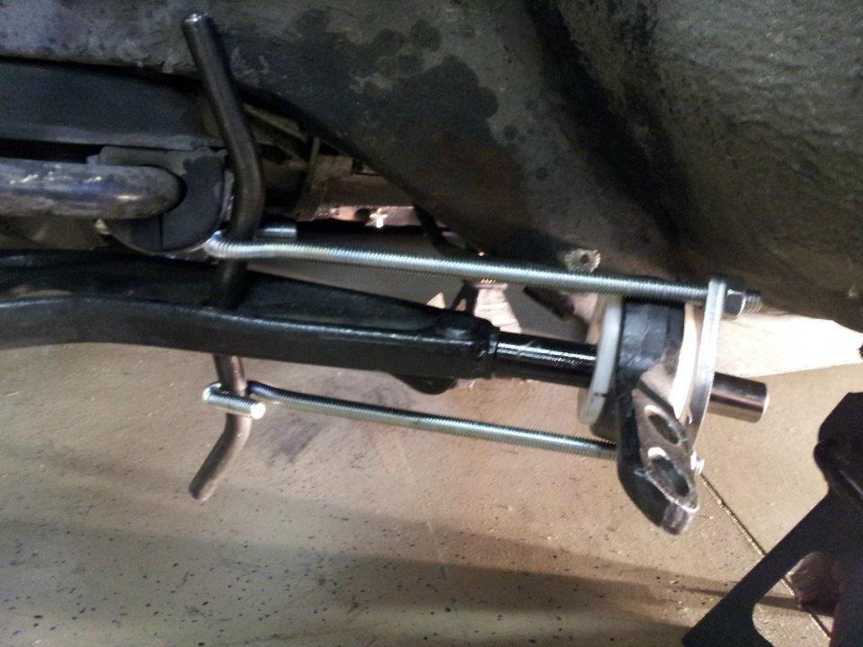 well, in the interest of putting more information out there, here's a pic of my "special tool" that I made out of stuff sitting around the garage to pull the M3 offset bushings on. A bit cumbersome, but it worked pretty easily......