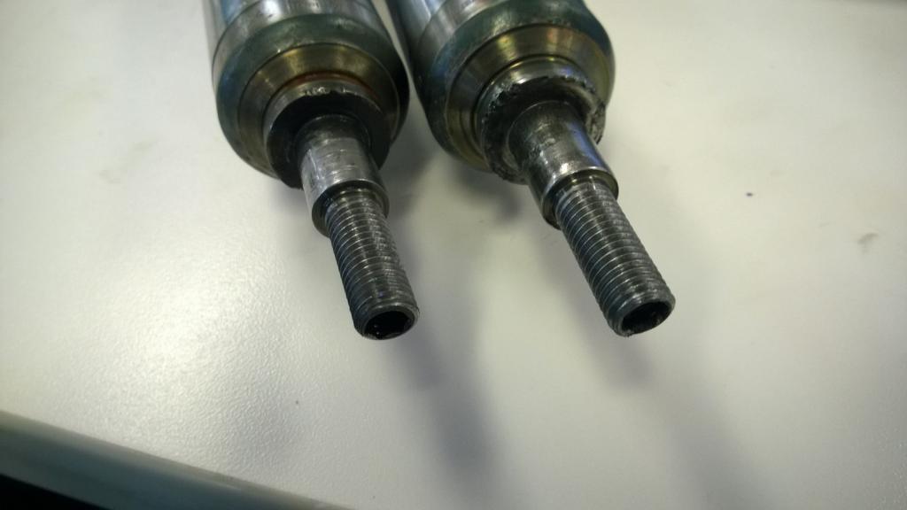 Had the struts thrown on a lathe at work and turned down the stripped/damaged threads and re-threaded with M10. The new threads look great. The only slight issue is that the allen socket at the top gets pretty close to the edge since the PO had bent the shafts when cranking on them. All the same I think that they're going to work out nicely.1987 325 w/ M52b28 - Bronzit
