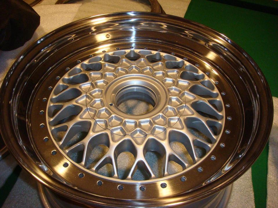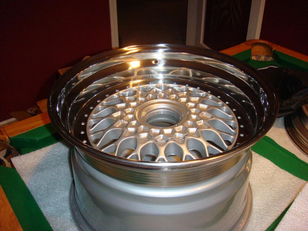 Started off with a set of high offset BBS RS 5x130 16" wheels with .5" & 1" lips, blasted the barrells and faces and had them powdercoated with brilliant silver with a coat of clear on the second bake.