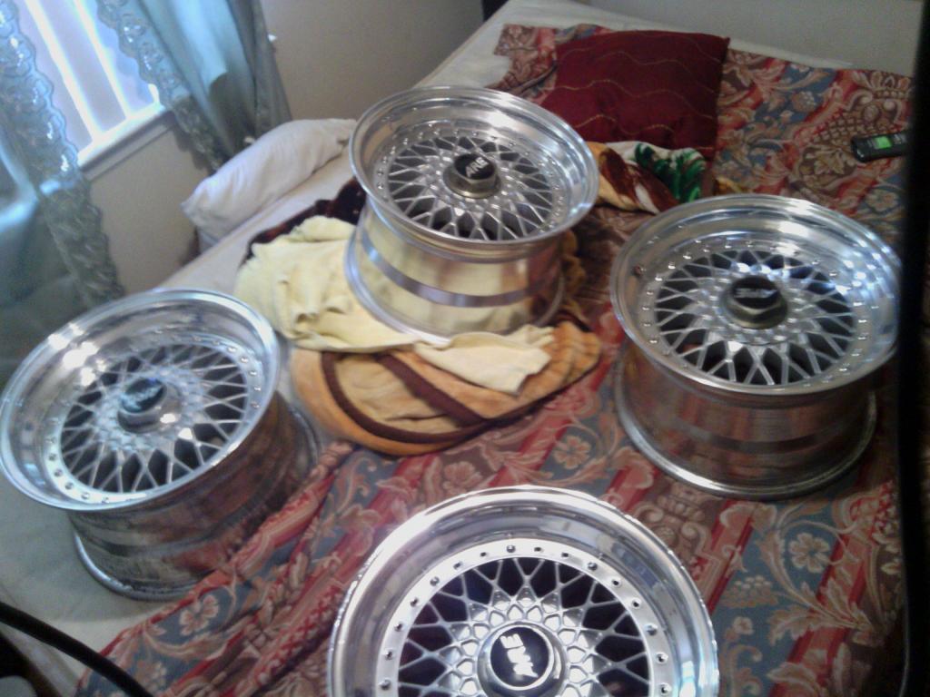 Wheels are DONE! powdercoat came out awesome! not sure if you guys can see the metallic flakes it has on them but none the less they are awesome...but now that I finished these wheels a very good deal on a 1jz came up so I might put these up for sale. Not sure of price as of yet, It does have all the center caps! and believe me these center caps are almost impossible to find! Specs are as follow : 16 x 9.5, 5 x 120 +20 offset.Comment