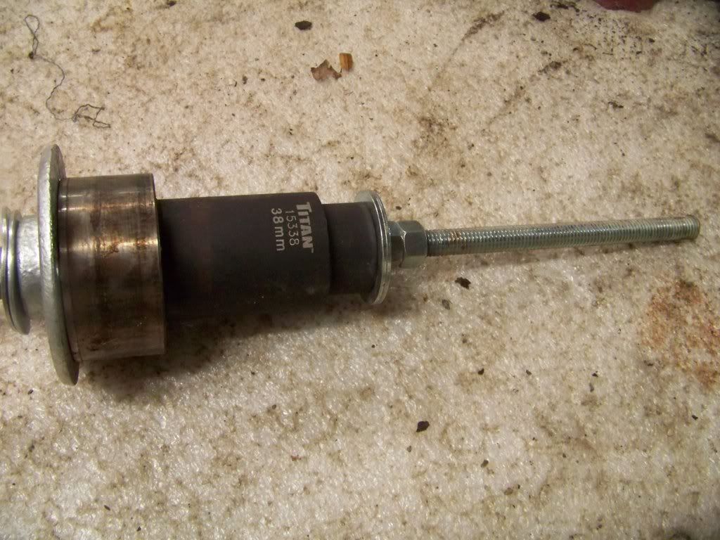 I used a 38mm deep socket and hammer to punch out the old bearing from the trailing arm, here it is rigged in a stationary fashion the the center of the inner race. You can just use your hand to hold the socket at first but then it just harder as the bearing starts to come out, this contraption hold the socket in place and allows you to hammer on the end of the threaded rod to drive the bearing out. This threaded rod can also be used to create a puller to pull the new bearing and hum back into place.