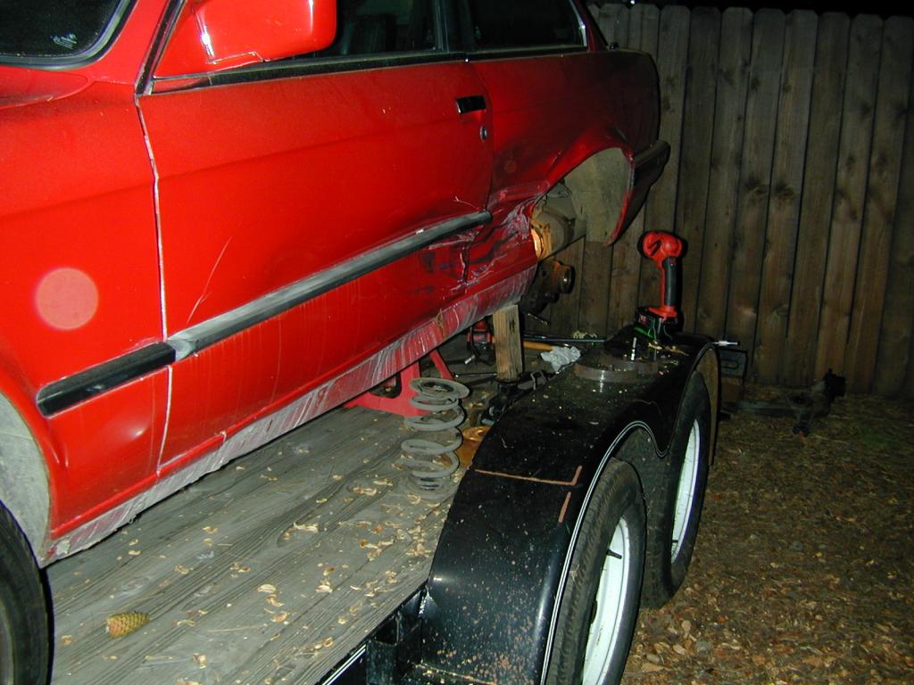 Inside was Sweet, great sport seats, perfect dash, rolling the cheapo Sportmax wheels, showing 160k and a 5-speed, plastic bumper set-up, etc. I'm happy for the $300 spent. The left rear wheel was pushed back, and whatever frame damage. I grab a salvage trailing arm and CV joint and spend a couple hours at night, for a few nights, wrestling the parts back & forth. Thanks for all those DIY posts everywhere! Once those were in, took the 91 around the block a few times, runs great, shifts great, big smiles. The Left rear wheel however is still not in-line, so it's the subframe and end-of-story for the chassis on this one & me. My daughter keeps saying she wants to drive it wrecked, can't we keep it. No way, not going to insure it, etc., we bought it for the 5-speed I tell her. It's almost a driveable beater but not quite. For it to live it needs a shell, right?