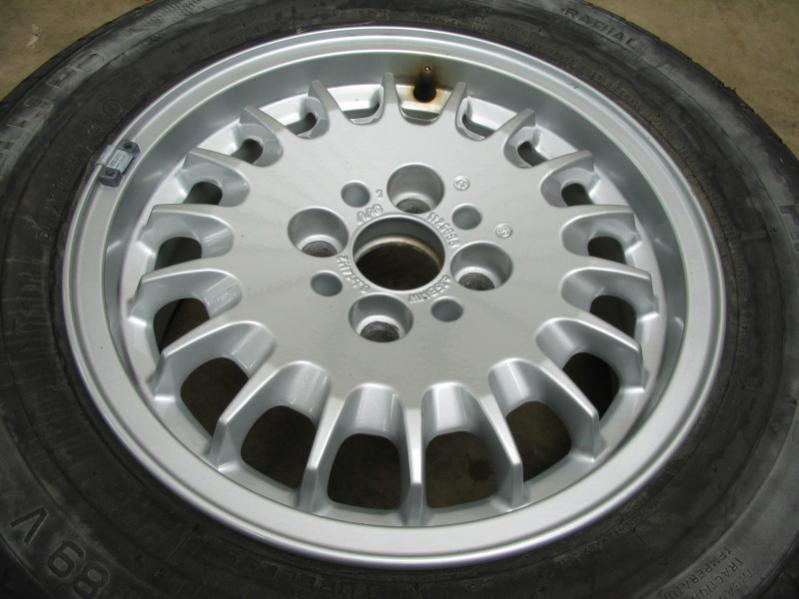 They are badly in need of a refinish BUT they appear to be straight with very little curbage or deep scratches. Here is a pic of one of them, and prop'd up on my Touring,which as of right now rides on Hartge/Bilstein suspension taken off of an E30 that I had bought for parts. BTW, I have (3) old spring pads added to each side in the rear, so it's probably 10-15mm higher than normal. This car is my parts hauler/DD b*itch, and I still have to put the Anhangerkupplung/trailer hitch on.