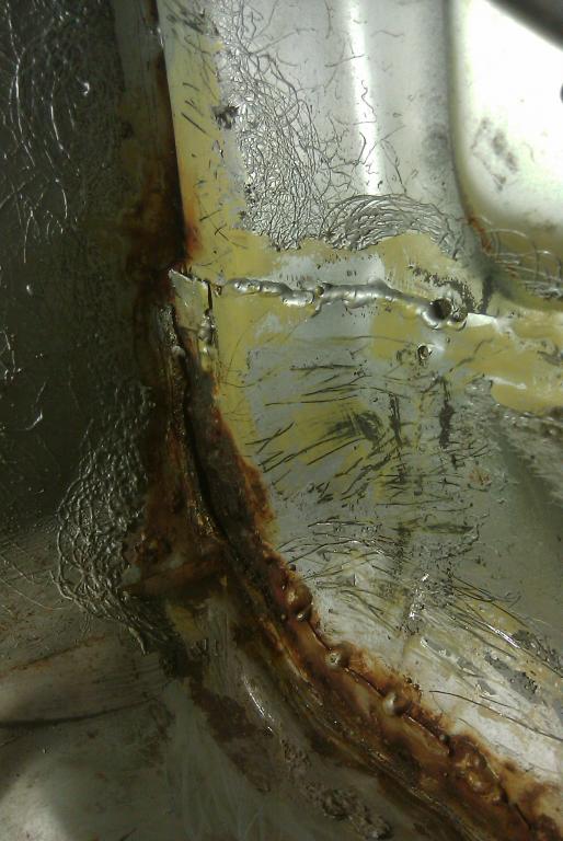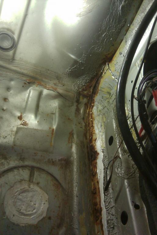 I've been chasing a passenger side wet carpet issue since it started raining here in the NW. First time I pulled up the carpet I found a loose floor plug and sealed entire area with sealer. Next rain storm it got wet again and I pulled up the carpet and sealed the other two plugs. Just this last week the carpet gets wet for a third time and I'm thinking WTF!? So I pull the carpet completely out of the passenger side and start looking for a hole or crack. I notice this rubbery stuff along the floorboard from the firewall to the passenger door. I peeled it up with a knife to reveal this (see picture 1). Upon closer inspection, I see what appears to be spot welds and a some form of a repair. Dont mind the scratches, thats the knife scraping off the rubber (see picture 2). So now I'm all worried that the PO wrapped this car around a tree and somehow had it put back together so I take the fender off to have a look. (see picture 3). I measured the whole car and upon inspection, its square and straight as can be, no frame or body wrinkle anywhere. I traced the leak/tear to be at the very bottom of the car right at the bottom where the fender meets the rocker. it must be a hairline crack but sure is allowing water in. I poked at the rust inside the car and it isn't soft or eaten through, just heavy surface...some sanding and rust mort or por15 should clear it up.