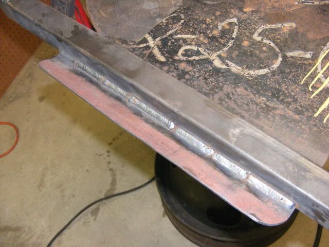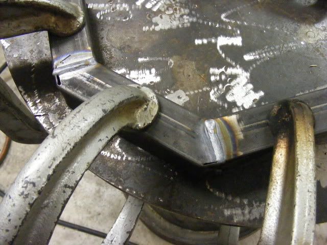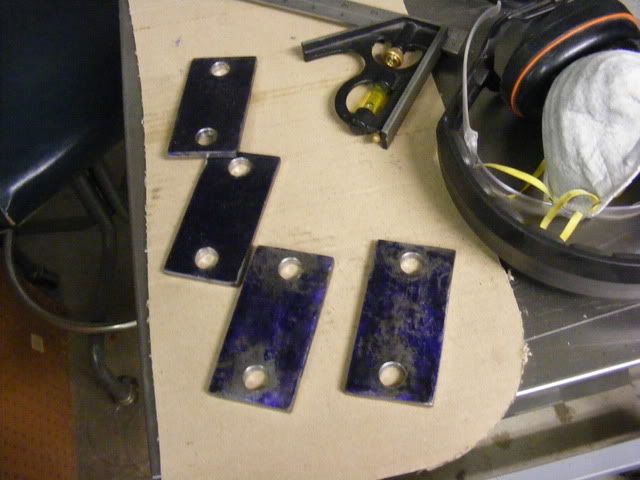 I decided to add another set of gussets to the frame to help absorb impact loads, so another set of flanges made. This shows how I made them up, welded nuts to the backside, then notched the frame to make the plate fit flush, then weld up.