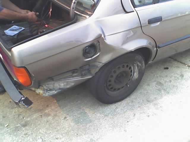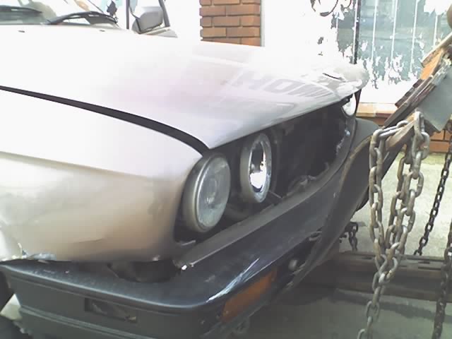 Yeah i wrote my car off. Was driving onto a freeway onramp and my dodgy assed auto gearbox was in too high a gear, and because the kickdown is broken i manually pushed it down a gear. But i think it went down about 2. It was raining and the car overeved and slid gently into the side barrier. But was on a corner, so i wa then flung off and whacked the other side of the barriers. So yeah i got off lucky, wasnt hurt at all. My car is fucked though. Smacked the rear quarter panel and folded the boot. The front also too some damage with both fenders damaged and the radiator whacked in. Also snapped the control arm on the right.