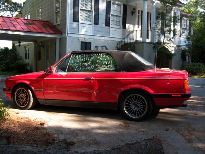 even mess with getting my little brothers' 318i fixed and back on the road. I keep going back and forth on it. The body damage is not that bad on it. I already know what i want to do it. Smoked smileys, GCs with the modified struts to go lower( Elliot got to help me out with that), IS lip, Polished Alpinas (Got Those) or Porsche wheels. Its just that engine.:( Ill just try and get it magazine worthy before December. here the damage: