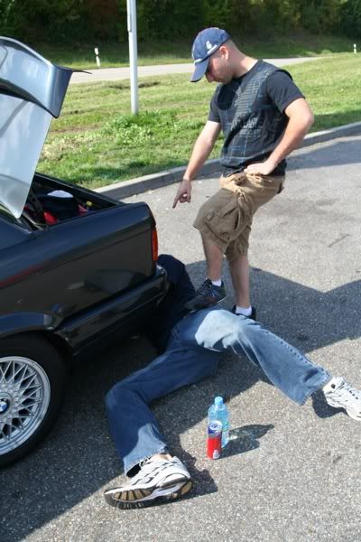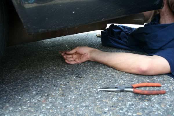 Yan discribing how we're going to use bungy cords and wire to fix the exhaust.
