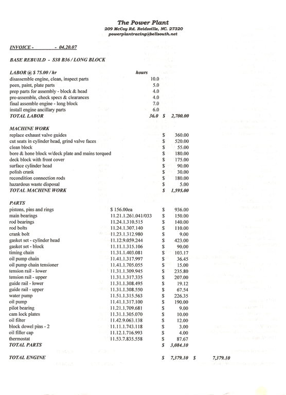 We quoted a guy the cost of an S38 engine rebuild and he didnt believe the cost. A month or so later he came back and told us that some guy had "rebuilt" the engine for $1300, everything was new :roll:.