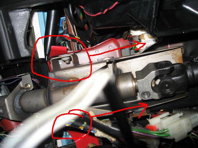 3) Should be a bolt under, or near the red circle. The green circle is where the column 'slips' into the chassis. PUSH THE SHAFT FORWARD [sound familiar????]