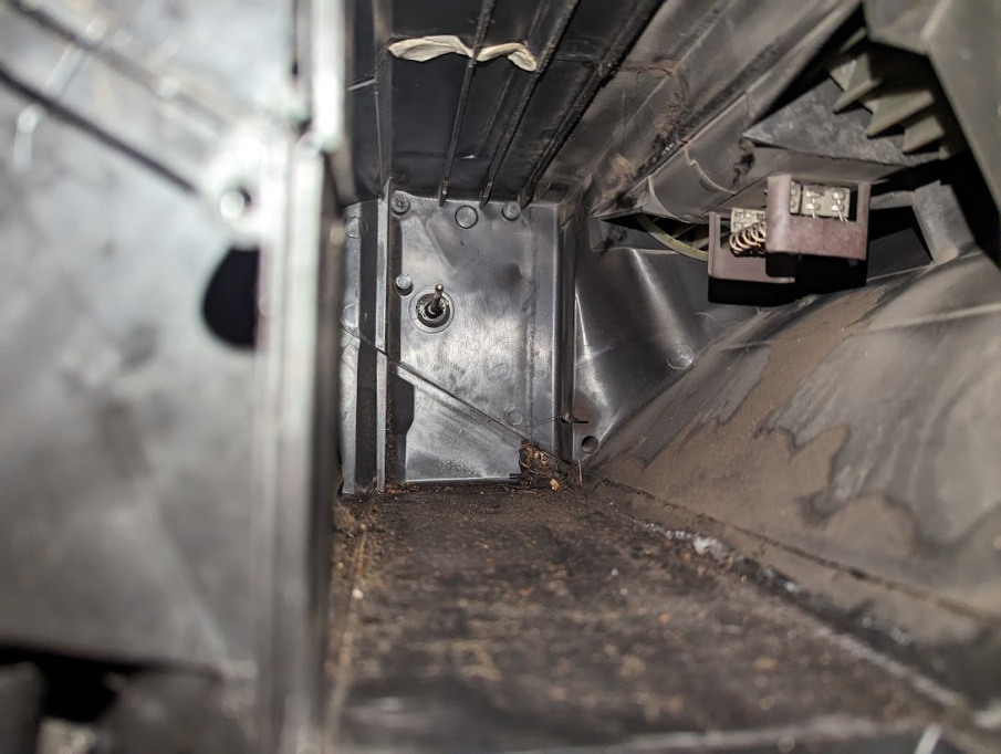 Anyway, now everything is clean and ready for installation. Moving back to evaporator removal, I managed to unclip a zip tie holding the main harness beneath the passenger-side dashboard and was able to wiggle the evaporator out to some extent. I couldn't remove it completely, and was about to give up when I decided to remove a few metal retaining clips along the bottom of the dashboard. This freed up an additional 1/8" to 1/4" of space, which was just enough to extract the evaporator entirely. I was astonished by the amount of mud, dirt, and debris that had accumulated on it. Considering its condition, I highly doubt the system would perform optimally without replacing it. While I could have rinsed it off and cleaned it, I've taken the advice of a good friend and HVAC professional to go ahead and replace it instead. I suspect that for those who have converted their R12 system to R134a and been unsatisfied with the results, this could potentially be the issue.