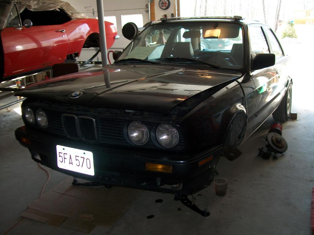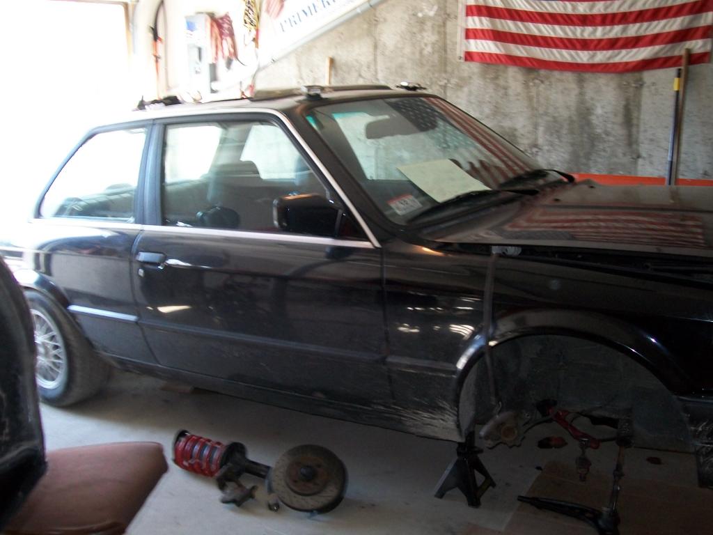 so this is how my car sits. waiting to be put back together. new control arm, treehouse cab, h&r race, drop hats. i cant do it with one hand. someone come HELP!!!